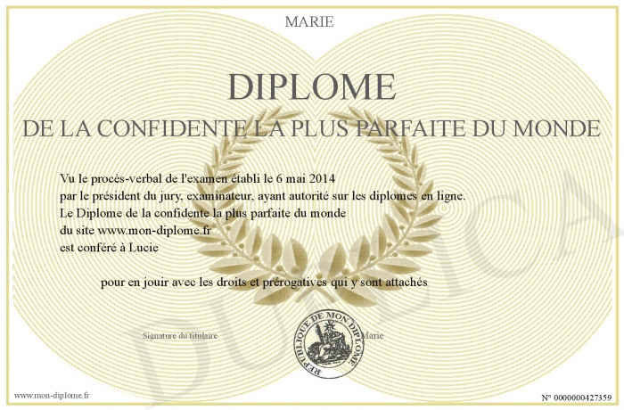 Envoyez par email votre Diplôme de la confidente la plus parfaite du monde personalisé