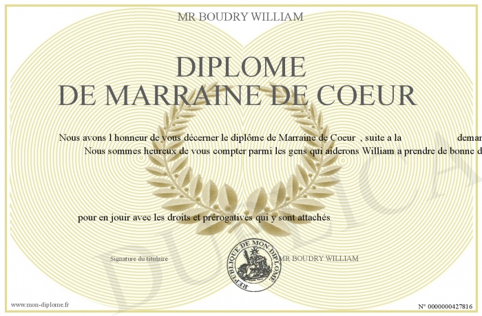 Envoyez par email votre Diplôme de Marraine de Coeur personalisé