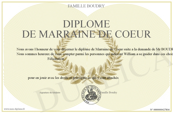 Envoyez par email votre Diplome de Marraine de Coeur personalisé