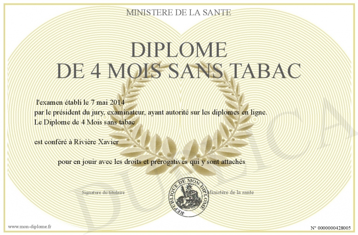 Envoyez par email votre Diplôme de 4 Mois sans tabac personalisé