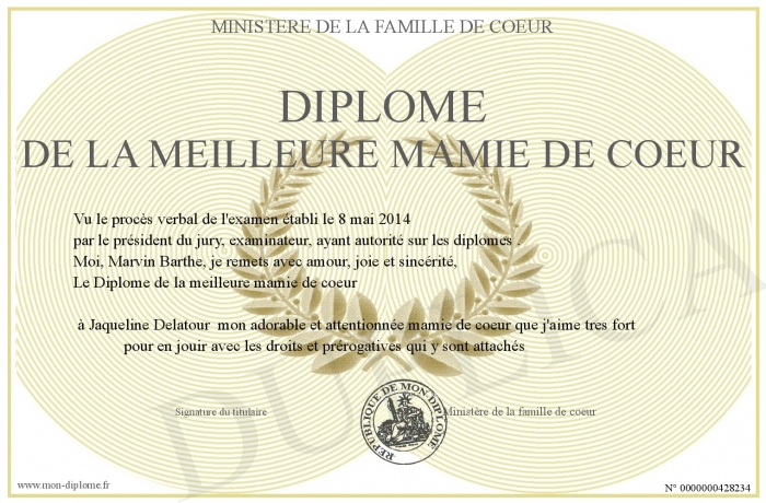 Envoyez par email votre Diplôme de la meilleure mamie de coeur personalisé