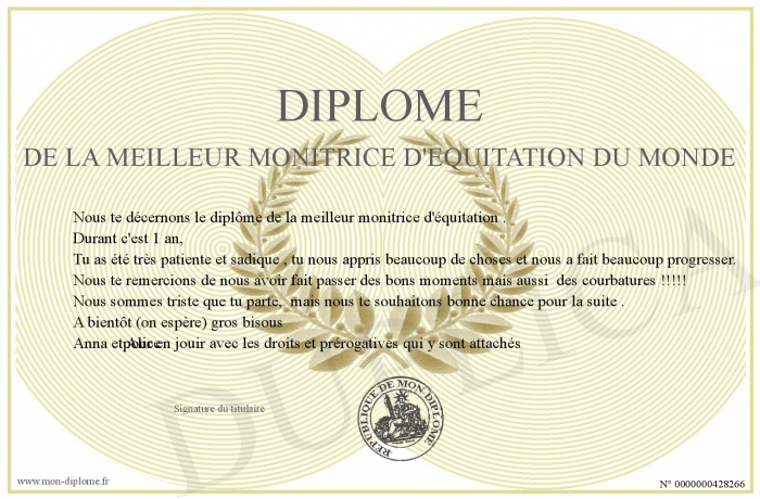 Envoyez par email votre diplome de la meilleur monitrice d'equitation du monde personalisé