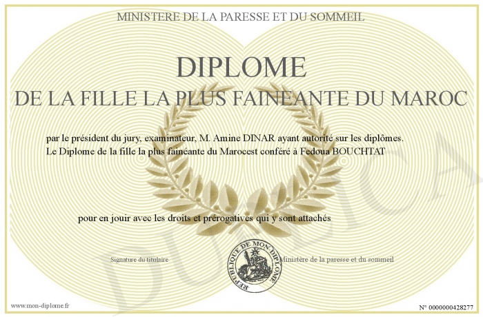 Envoyez par email votre Diplôme de la fille la plus fainéante du Maroc personalisé