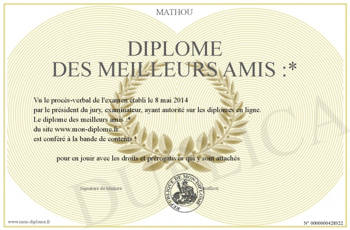 Envoyez par email votre diplome des meilleurs amis :* personalisé
