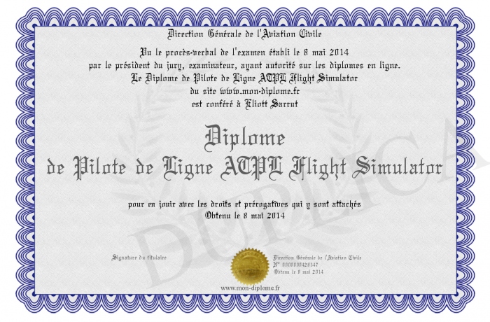 Envoyez par email votre Diplome de Pilote de Ligne ATPL Flight Simulator personalisé