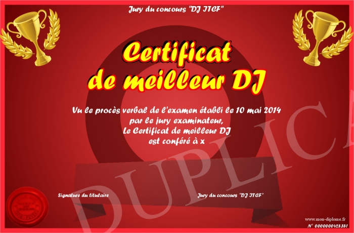 Envoyez par email votre Certificat de meilleur DJ personalisé