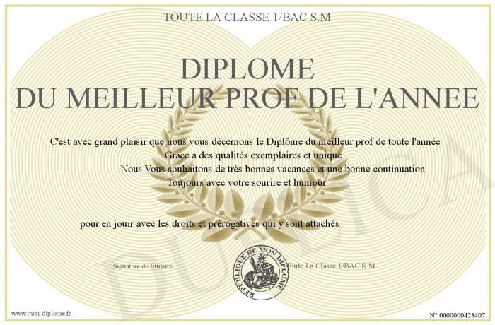 Envoyez par email votre Diplôme du meilleur prof de l'année personalisé