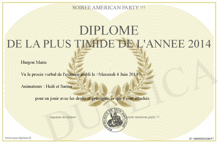 Envoyez par email votre Diplôme de la plus timide de l'année 2014 personalisé