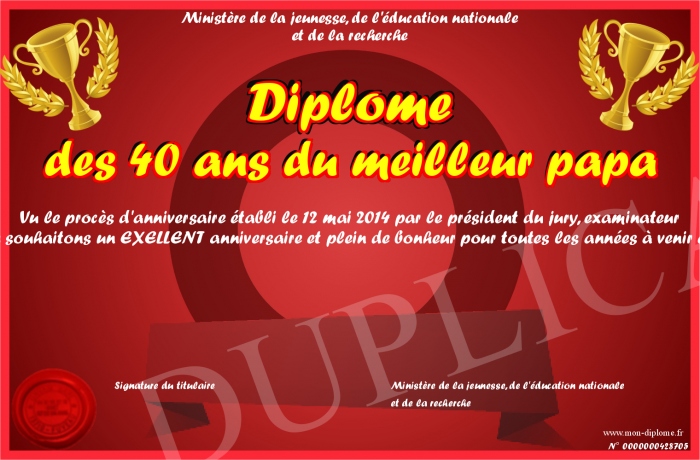 Envoyez par email votre Diplôme des 40 ans du meilleur papa personalisé