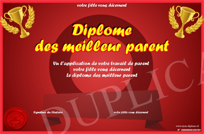 Envoyez par email votre Diplôme des meilleur parent personalisé