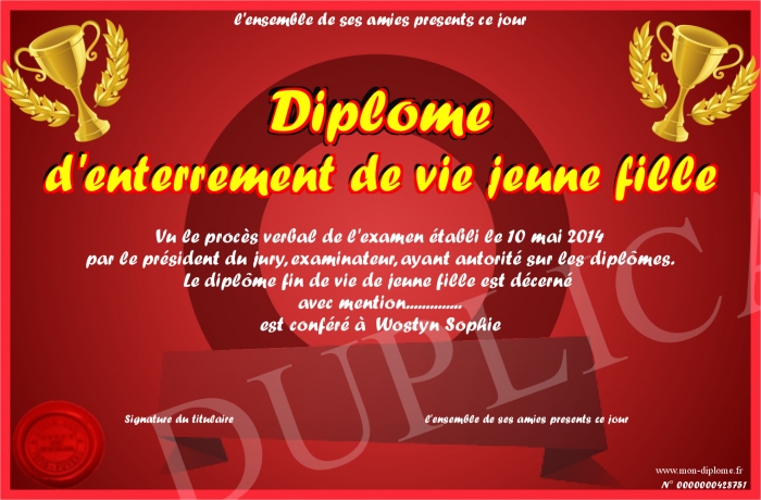 Envoyez par email votre Diplome d'enterrement de vie jeune fille personalisé