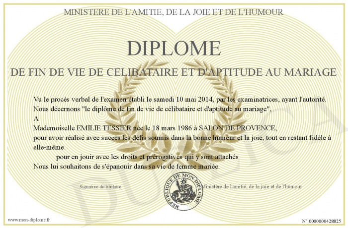 Envoyez par email votre Diplôme de fin de vie de célibataire et d'aptitude au mariage personalisé