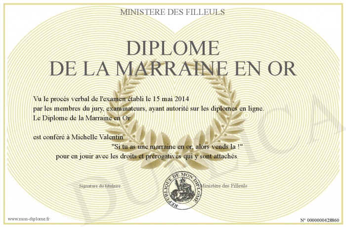 Envoyez par email votre Diplôme de la Marraine en Or personalisé