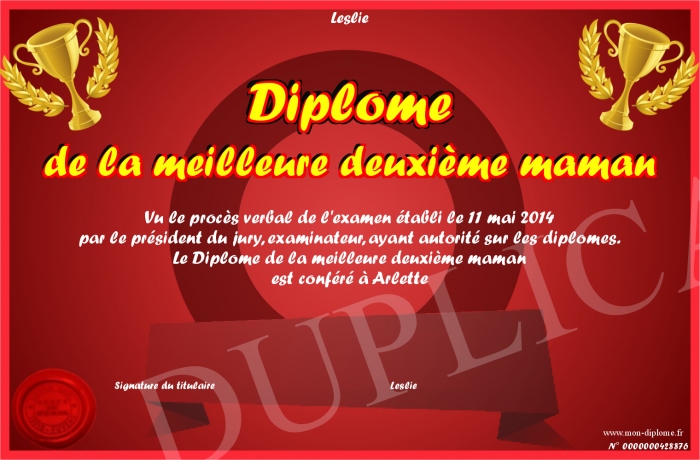 Envoyez par email votre Diplôme de la meilleure deuxième maman personalisé