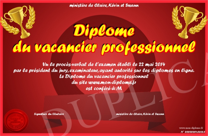 Envoyez par email votre Diplôme du vacancier professionnel personalisé