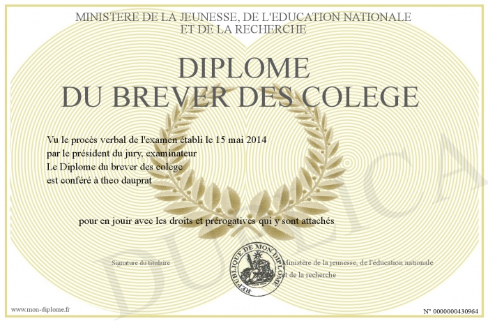 Envoyez par email votre Diplôme du brever des colege personalisé