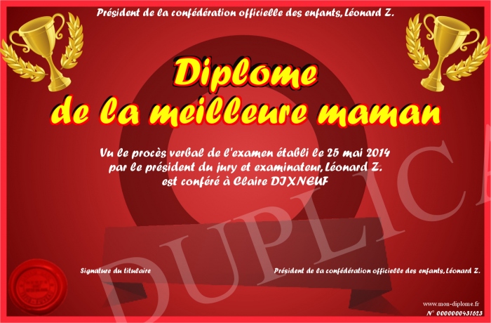 Envoyez par email votre Diplôme de la meilleure maman personalisé