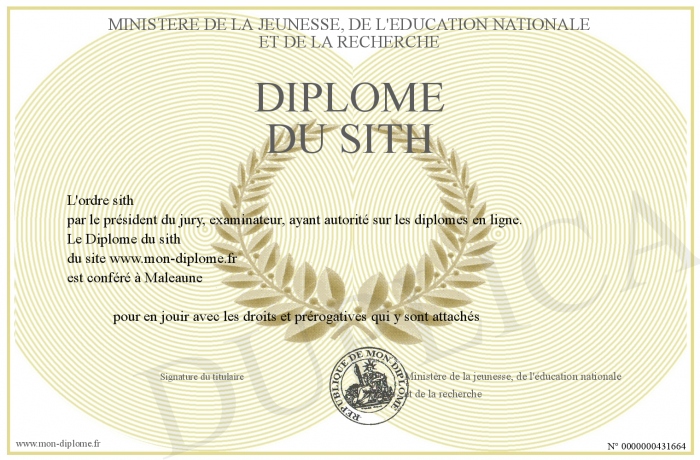 Envoyez par email votre Diplôme du sith personalisé