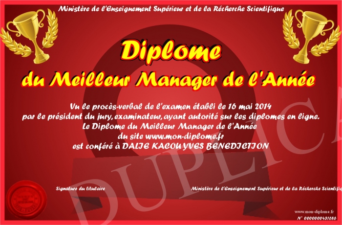 Envoyez par email votre Diplôme du Meilleur Manager de l'Année personalisé