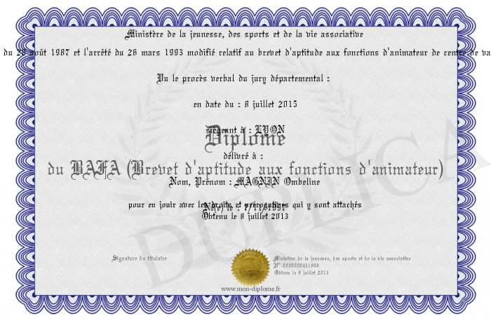 Envoyez par email votre Diplôme du BAFA (Brevet d'aptitude aux fonctions d'animateur) personalisé