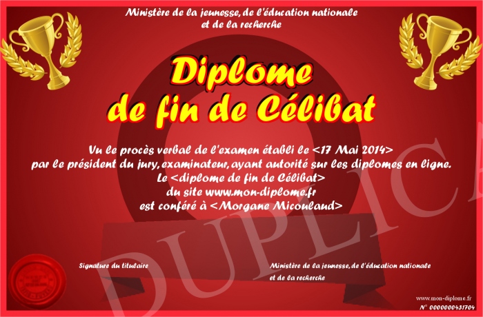 Envoyez par email votre Diplôme de fin de Célibat personalisé