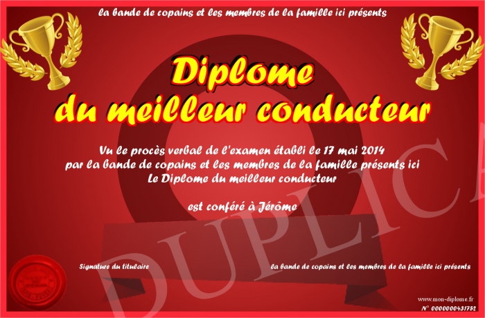 Envoyez par email votre Diplôme du meilleur conducteur personalisé