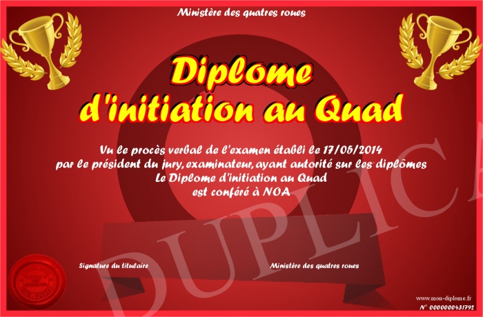 Envoyez par email votre Diplôme d'initiation au Quad personalisé