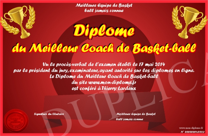 Envoyez par email votre Diplôme du Meilleur Coach de Basket-ball personalisé
