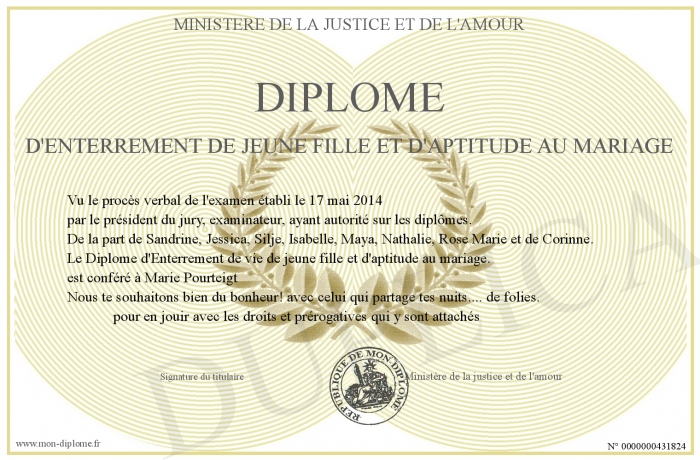 Envoyez par email votre DIPLOME D'ENTERREMENT DE JEUNE FILLE ET D'APTITUDE AU MARIAGE personalisé