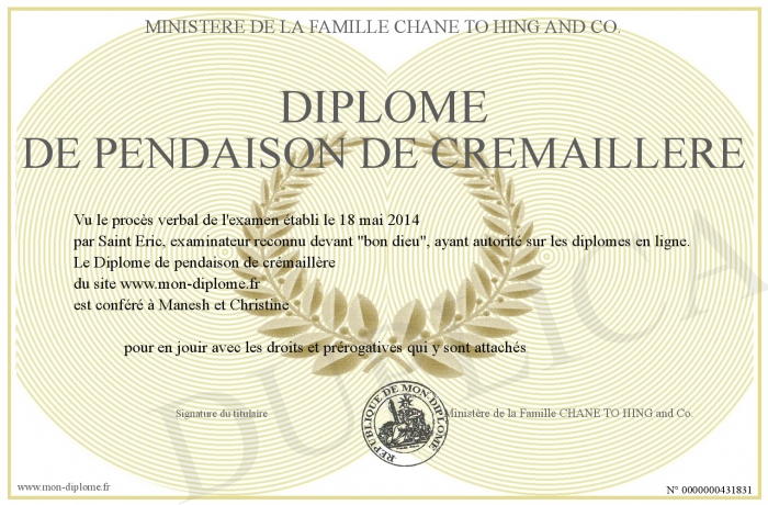 Envoyez par email votre Diplôme de pendaison de crémaillère personalisé