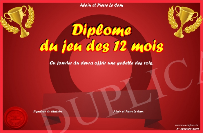 Envoyez par email votre Diplôme du jeu des 12 mois personalisé