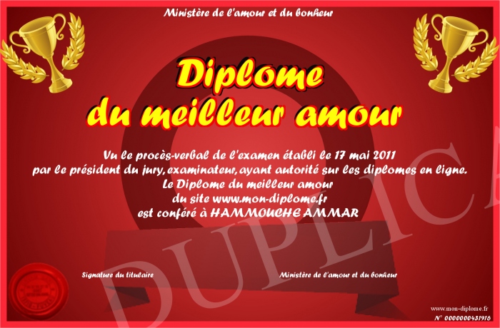 Envoyez par email votre Diplôme du meilleur amour personalisé