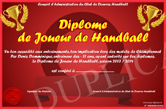 Envoyez par email votre Diplôme de Joueur de Handball personalisé