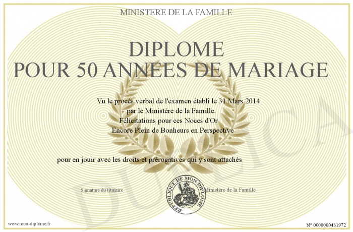 Envoyez par email votre DIPLOME pour 50 années de mariage personalisé