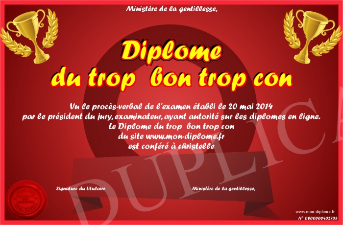 Envoyez par email votre Diplôme du trop bon trop con personalisé
