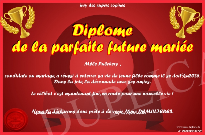Envoyez par email votre Diplôme de la parfaite future mariée personalisé