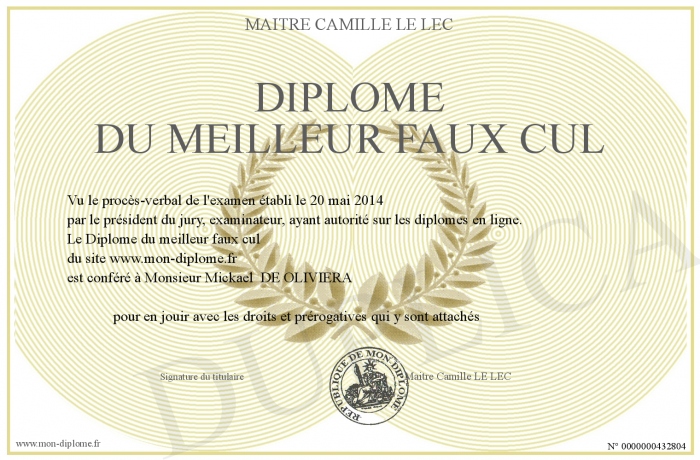 Envoyez par email votre Diplôme du meilleur faux cul personalisé