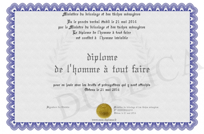 Envoyez par email votre diplôme de l'homme à tout faire personalisé