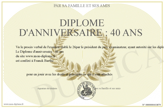 Envoyez par email votre Diplôme d'anniversaire : 40 ans personalisé