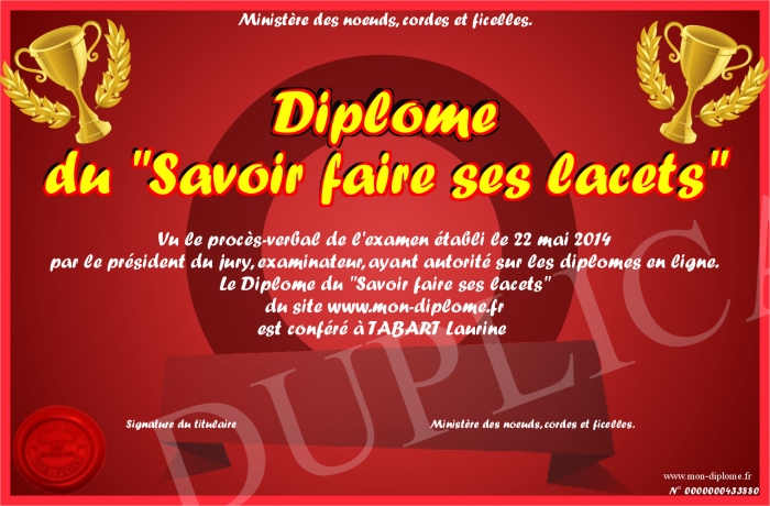 Envoyez par email votre Diplôme du -Savoir faire ses lacets- personalisé
