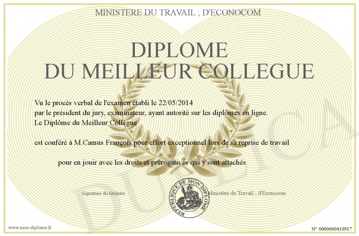 Envoyez par email votre Diplôme du Meilleur collègue personalisé