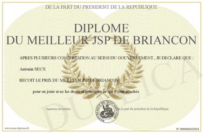 Envoyez par email votre Diplôme du meilleur jsp de briancon personalisé