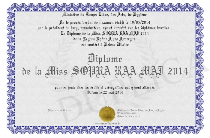 Envoyez par email votre Diplôme de la Miss SOPRA RAA MAI 2014 personalisé