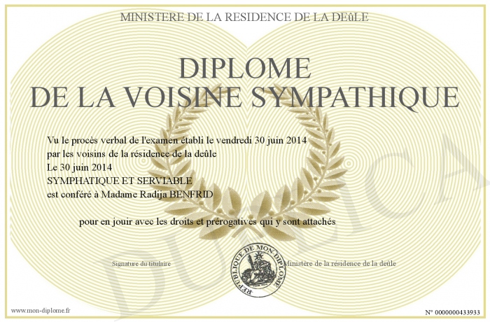 Envoyez par email votre Diplôme de la voisine sympathique personalisé