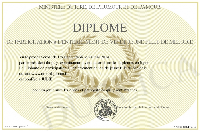 Envoyez par email votre Diplome de participation à l'enterrement de vie de jeune fille de Mélodie personalisé