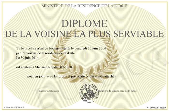 Envoyez par email votre Diplôme de la voisine la plus serviable personalisé