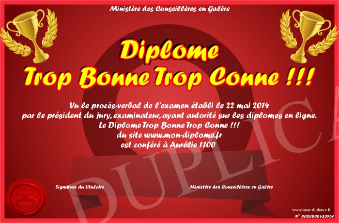 Envoyez par email votre Diplôme Trop Bonne Trop Conne !!! personalisé