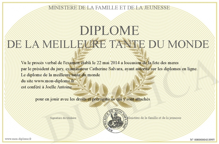 Envoyez par email votre diplome de la meilleure tante du monde personalisé