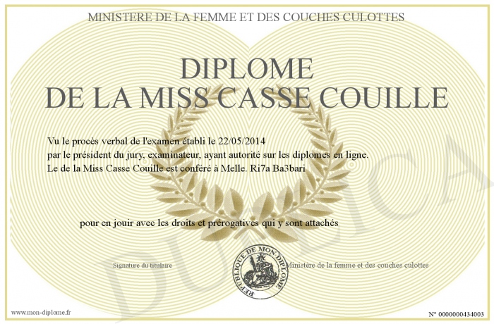 Envoyez par email votre Diplôme de la Miss Casse Couille personalisé