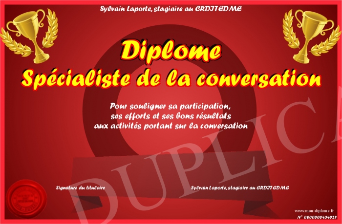Envoyez par email votre Diplôme Spécialiste de la conversation personalisé